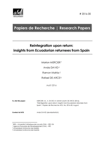 Using the ECM2 survey data on Ecuadorian migrants returning from Spain, we investigate the determinants of reintegration upon return. We study how the migration experience, but also the before- and after-migration characteristics, correlate with migrants’ outcomes upon return. We adopt a broad conception of reintegration, considering jointly labor market-related outcomes that proxy for structural reintegration and subjective indicators that provide insights on sociocultural reintegration. The determinants of these two types of outcomes appear to be different: reintegration indeed encompasses multiple dimensions which cannot be captured by a single indicator. Our results suggest that return assistance programs’ efficiency in helping reintegration could be improved by (i) targeting, ex-ante, returnees who plan to launch their own business, and, ex-post, the most vulnerable workers (women, older returnees, unemployed), and (ii) facilitating the labor market integration of foreign-educated returnees. They also call for further research to better understand the consequences of these programs.