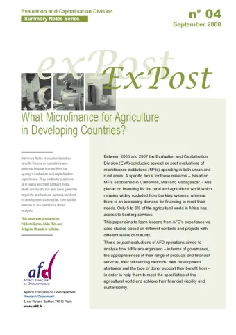 Between 2005 and 2007 the Evaluation and Capitalisation Division (EVA) conducted several ex post evaluations of microfinance institutions (MFIs) operating in both urban and rural areas. A specific focus for these missions – based on MFIs established in Cameroon, Mali and Madagascar – was placed on financing for the rural and agricultural world which remains widely excluded from banking systems, whereas there is an increasing demand for financing to meet their needs. Only 5 to 6% of the agricultural world in Africa has access to banking services.
