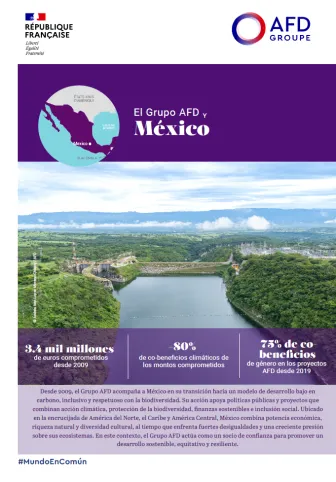 Desde 2009, el Grupo AFD acompaña a México en su transición hacia un modelo de desarrollo bajo en carbono, inclusivo y respetuoso con la biodiversidad. Su acción apoya políticas públicas y proyectos que combinan acción climática, protección de la biodiversidad, finanzas sostenibles e inclusión social. Ubicado en la encrucijada de América del Norte, el Caribe y América Central, México combina potencia económica,