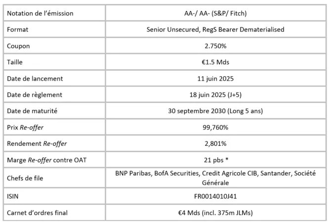 - A la suite du resserrement de 3pbs, la demande investisseur s’est renforcée, permettant à l’émetteur d’annoncer les termes finaux à 11h50 CET, avec une taille fixée à 1,5Mds. Au moment de la fermeture du livre d’ordres, celui-ci avait atteint €4 milliards (dont €370 millions d’intérêt JLM).