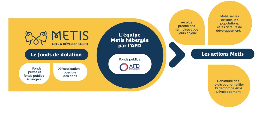 Créé en 2021, le fonds Metis Arts et développement est hébergé au sein de l’AFD. Visant l’atteinte des Objectifs de développement durable (ODD), il finance des initiatives réunissant un artiste, un opérateur « classique » de développement et une population locale sur un territoire. Leur rencontre autour d’un enjeu de développement qui les concerne tous, le processus créatif qui les réunit et la création artistique finale qui résulte du projet financé donnent lieu à des expériences transformatrices pour l’ensemble des parties prenantes. Metis se veut passeur d’émotions, porteur de transformations.