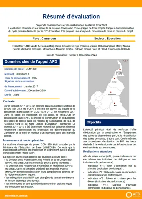 L’objectif principal des interventions était de renforcer l’offre d’éducation au Cameroun. L’évaluation s’est concentrée sur les composantes de construction, réhabilitation et équipement des salles de...