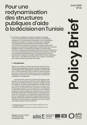 Les structures publiques d’analyse et d’aide à la décision ont un rôle essentiel pour orienter les décisions de politiques publiques. Si la Tunisie dispose d’institutions et de compétences relativemen...
