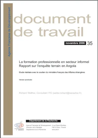 Le présent rapport est partie intégrante du travail d‘enquête et d‘analyse lancé par le département de la Recherche de l’Agence Française de Développement (AFD) sur la formation en secteur informel. L’enquête en Angola est la dernière d‘une série de missions de terrain effectuées dans sept pays d‘Afrique dont l’Afrique du Sud, le Bénin, le Cameroun, l’Ethiopie, le Maroc et le Sénégal.