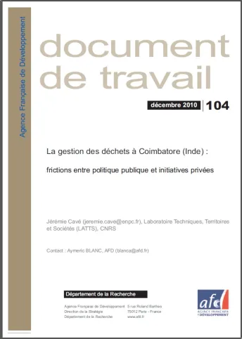 Cette enquête de terrain, financée par le département de la Recherche de l’AFD, s‘inscrit dans le cadre des recherches de doctorat en aménagement urbain de l’auteur. Dans sa thèse, qui porte sur les modes de gestion des déchets urbains dans les pays émergents à travers une comparaison entre l’Inde et le Brésil, l’auteur s‘intéresse à deux grandes villes, Vità³ria (Brésil) et Coimbatore (Inde).