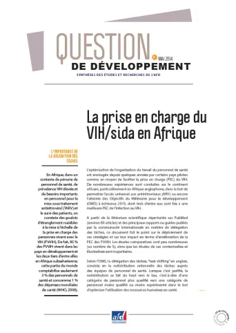 En Afrique, dans un contexte de pénurie de personnel de santé, de prévalence VIH élevée et de besoins importants en personnel pour la mise sous traitement antirétroviral (TARV) et le suivi des patients, on constate des goulots d’étranglement nuisibles à la mise à l’échelle de la prise en charge des personnes vivant avec le VIH (PVVIH). De fait, 95 % des PVVIH vivent dans les pays en développement et les deux tiers d’entre elles en Afrique subsaharienne; cette partie du monde comptabilise seulement 3 % des personnels de santé et consomme 1 % des dépenses mondiales de santé (WHO, 2006).