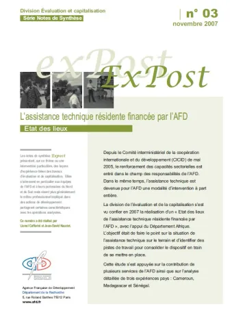 Depuis le Comité interministériel de la coopération internationale et du développement (CICID) de mai 2005, le renforcement des capacités sectorielles est entré dans le champ des responsabilités de l’AFD. Dans le même temps, l’assistance technique est devenue pour l’AFD une modalité d‘intervention à part entière. La division de l’évaluation et de la capitalisation s‘est vu confier en 2007 la réalisation d‘un « Etat des lieux de l’assistance technique résidente financée par l’AFD », avec l’appui du Département Afrique. L’objectif était de faire le point sur la situation de l’assistance technique sur le terrain et d‘identifier des pistes de travail pour consolider le dispositif en train de se mettre en place. Cette étude s‘est appuyée sur la contribution de plusieurs services de l’AFD ainsi que sur l’analyse détaillée de trois expériences pays : Cameroun, Madagascar et Sénégal.