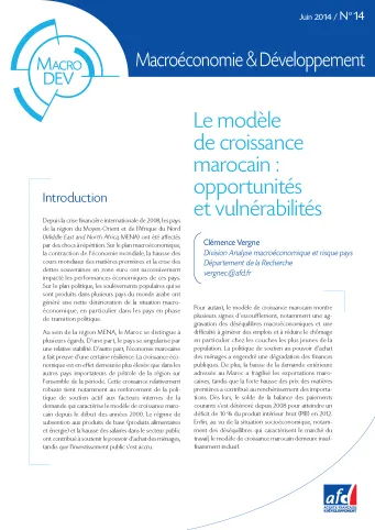 Dans une région affectée par divers chocs depuis la crise financière internationale de 2008, le Maroc se singularise par une relative stabilité et par une certaine résilience. Pour autant, le modèle de croissance du Maroc montre plusieurs signes d‘essoufflement, notamment l’aggravation des déséquilibres macroéconomiques qu’il génère et la difficulté à créer des emplois et à réduire le chômage, en particulier chez les jeunes. Cette étude présente une analyse de la situation macroéconomique du Maroc et s‘articule autour de quatre parties :
