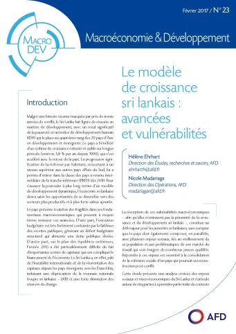 Le pays a bénéficié d‘un rythme de croissance robuste et stable sur une longue période qui s‘est accéléré avec le retour de la paix. La progression significative de la richesse par habitant lui a permis d‘entrer dans la classe des pays à revenu intermédiaire de la tranche inférieure (PRITI) dès 2010. Pour s‘assurer la poursuite à plus long terme d‘un modèle de développement dynamique, l’économie sri lankaise devra saisir les opportunités de se diversifier vers des secteurs plus productifs et à plus forte valeur ajoutée. Le pays présente toutefois des fragilités dans ses fondamentaux macroéconomiques qui peuvent à moyen terme menacer ces avancées.