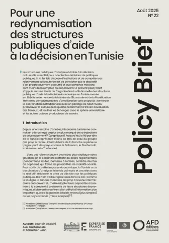 Les structures publiques d’analyse et d’aide à la décision ont un rôle essentiel pour orienter les décisions de politiques publiques. Si la Tunisie dispose d’institutions et de compétences relativement solides, force est de constater que le dispositif s’est progressivement essoufflé et que certaines missions sont moins bien remplies qu’auparavant. Le présent policy brief s’appuie sur une étude de l’organisation institutionnelle des structures publiques d’aide à la décision économique en Tunisie menée en 2024 à la demande du ministère de l’Économie et de la Planification. Trois axes complémentaires d’amélioration sont proposés : renforcer la coordination institutionnelle avec un pilotage à haut niveau ; promouvoir la culture de la qualité notamment à travers l’évaluation des travaux ; et faciliter les échanges avec la sphère universitaire et les autres acteurs producteurs de savoirs.